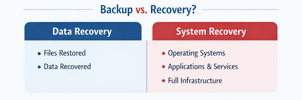Modern ransomware attacks often target infrastructure, operating systems, and backup environments themselves. As a result, organizations that rely solely on backup may struggle to restore operations quickly—or at all.