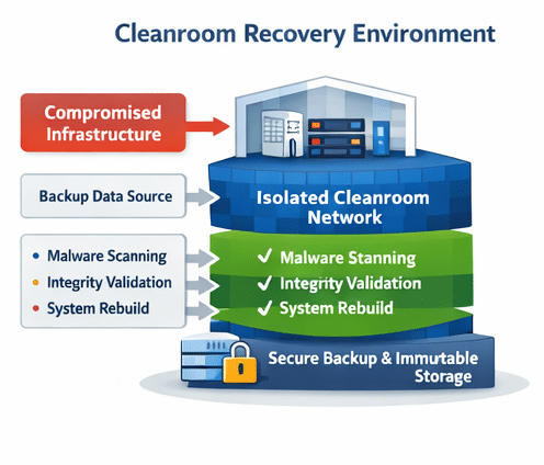 Cleanroom recovery provides a secure environment for restoring systems after cyber incidents.